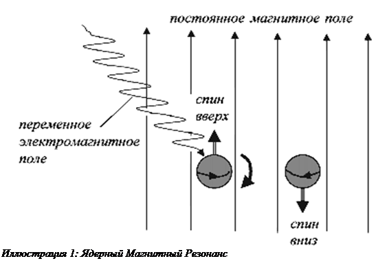 Рассмотрим явление ЯМР на примере простейшего ядра – водорода. Ядро водорода это протон, имеющий определённое значение собственного механического момента количества движения (спина). В соответствии с квантовой механикой вектор спина протона может иметь только два взаимно противоположных направления в пространстве, условно обозначаемых словами “вверх” и “вниз”. Протон имеет также и магнитный момент, направление вектора которого жёстко привязано к направлению вектора спина. Поэтому и вектор магнитного момента протона может быть направлен либо “вверх”, либо “вниз”. Таким образом, протон можно представить как микроскопический магнитик с двоякой возможной ориентацией в пространстве. Если поместить протон во внешнее постоянное магнитное поле, то энергия протона в этом поле будет зависеть от того, куда направлен его магнитный момент. Энергия протона будет больше в том случае, если его магнитный момент (и спин) направлен в сторону, противоположную полю. Если магнитный момент (спин) протона направлен в ту же сторону, что и поле, то энергия протона, обозначаемая , будет меньше . Пусть протон оказался именно в этом последнем состоянии. Если теперь протону добавить энергию , то он сможет скачком перейти в состояние с большей энергией, в котором его спин будет направлен против поля. Добавить энергию протону можно, “облучая” его квантами электромагнитных волн с частотой омега.