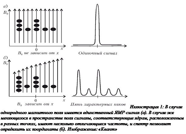 магнитное поле не зависит от х, то возникает одиночный сигнал (см. рис. а). Далее предположим, что посредством дополнительных катушек (по отношению к той, которая создает основное, направленное по оси z, магнитное поле) мы создаем дополнительное, меняющееся вдоль оси х, магнитное поле B0, причем его величина возрастает слева направо. При этом понятно, что для сфер с различными координатами сигнал ЯМР теперь будет соответствовать различным частотам и измеряемый спектр будет содержать в себе пять характерных пиков (см. рис. б). Высота этих пиков будет пропорциональна количеству сфер (т. е. массе воды), имеющих соответствующую координату, и, таким образом, в рассматриваемом случае интенсивности пиков будут относиться как 3:1:3:1:1. Зная величину градиента магнитного поля (т. е. скорость его изменения вдоль оси х), можно представить измеряемый частотный спектр в виде зависимости плотности атомов водорода от координаты х. При этом можно будет сказать, что там где пики выше, число атомов водорода больше: в нашем примере числа атомов водорода, соответствующих положениям сфер, действительно соотносятся как 3:1:3:1:1.