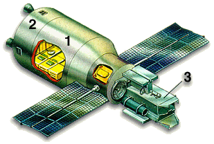 Обозначения: 1 - приборно-топливный отсек; 2 - агрегатный отсек; 3 - бортовой комплекс специального вооружения