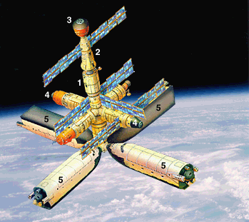 1 - базовый блок; 2 - центр управления боевыми блоками; 3 - многоразовый транспортный корабль "Заря"; 4 - модули боевой станции с прицельными комплексами; 5 - боевые модули (на базе фюзеляжа ОК «Буран»)