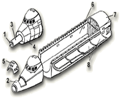 1 - стыковочный узел; 2 - носовая часть фюзеляжа (НЧФ); 3 - переходный отсек; 4 - герметичный модуль кабины; 5 - носовой блок двигателей управления; 6 - средняя часть фюзеляжа (СЧФ); 7 - хвостовая часть фюзеляжа (ХЧФ); 8 - створки отсека полезного груза с панелями радиационного теплообменника