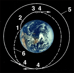 Схема полета ОК "Буран": 1 - старт; 2 - отделение разгонных блоков первой ступени; 3 - отделение разгонного блока второй ступени от ОК "Буран"; 4 - точки включения двигателей системы орбитального маневрирования; 5 - рабочая орбита; 6 - траектория спуска
