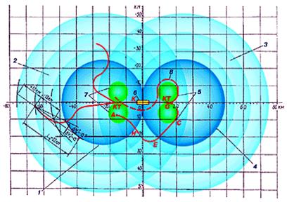 1 - западный ЦРЭ; 2 - штатная область приведения на высоту Н=20 км при нацеливании на западный ЦРЭ; 3 - то же на восточный ЦРЭ; 4 - восточный ЦРЭ; 5 - восточный ЦВК; 6 - взлетно-посадочная полоса; 7 - западный ЦВК; 8 - траектория полета ОК; АН - спираль отворота; НЕ - спираль поворота; ЕС - касательная к ЦВК; CG - дуга окружности ЦВК; GK - финишная прямая; КТ - ключевая точка Красным пунктиром показана траектория захода на посадку в первом полете.