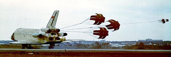 Торможение ОК осуществляется трехкупольным тормозным парашютом и тормозами колес основных стоек шасси, а также воздушным тормозом, используемым в качестве резервного при ручном управлении. Суммарный пробег в зависимости от направления и силы ветра и состояния поверхности ВПП не должен превышать 1800 м.