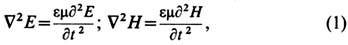 - амплитуды колебаний электрического и магнитного полей, w = 2pv - круговая частота этих колебаний, j - произвольный сдвиг фазы, k - волновой вектор, r - радиус-вектор точки, -оператор Лапласа, E |