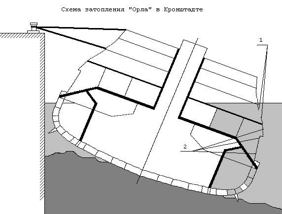 Вода хлынула на батарейную палубу, а через открытые люки погребов во внутренние помещения.«Орел» не перевернулся только благодаря мелководью у причальной стенки порта.