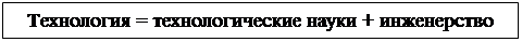 – последовательность материальных процессов и операций, реализация которых приводит к появлению продукта (потребительской стоимости) с необходимыми полезными для дальнейшего использования человеком свойствами [3]. Д. И. Менделеев определял технологию, как учение о выгодных приёмах переработки природных ресурсов в продукты, потребные для применения в жизни людей. Поэтому технологические науки являются фундаментом любых технологий.
