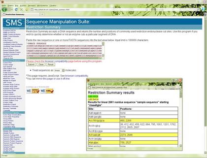 В качестве примера можно привести web-приложение Sequence Manipulation Suite [3]. Данное приложение работает on-line и включает в себя множество различных программ (более 50), которые значительно облегчают работу молекулярного биолога. Так, например, программа Restriction Summary (рисунок 1.1) позволяет быстро определить ферменты, разрезающие определенную последовательность ДНК; программа Reverse Translate преобразует аминокислотную последовательность белков в кодирующую данный белок нуклеотидную последовательность ДНК. Программа DNA Stats при вводе нуклеотидной последовательности ДНК и РНК определяет количество каждого азотистого основания в последовательности, а также процентное соотношение нуклеотидов и пар нуклеотидов, что может быть очень полезным для расчета температуры отжига праймеров.