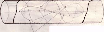 Анализируя схему видим, что экстремумы каждой из категорий реализуются в различное время и в строго определенной последовательности. Время проявления экстреминов рассматриваемых категорий /каждая из которых имеет 2 точки соприкосновения /в мах и мin/ с поверхностью цилиндра/ не совпадают, т.е. при голографическом описании релаксационные свойства категорий вещества, энергии и информации различны. Учитывая специфику сущности каждой из категорий порядок расположения экстремумов на временной оси следовало бы представить следующим образом: информация, энергия, вещество. В начале реализуется программа периодического процесса, затем таковая обеспечивается энергетическим эквивалентом и только после этого происходят определенные циклические трансформации структуры. Изложенное справедливо для первого полупериода ритма, во втором полупериоде наблюдается обратное расположение экстреминов: таким образом формируется симметричность обменных процессов, реализующихся последовательно в 1 и 2 полупериода.