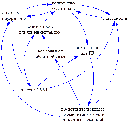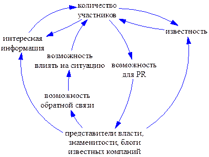 Для того чтобы отразить моё видение механизма того, как росла популярность ЖЖ, я построю причинно-следственную диаграмму. Рост каждой переменной в данной диаграмме приводит к росту переменной, с которой она связана стрелкой.