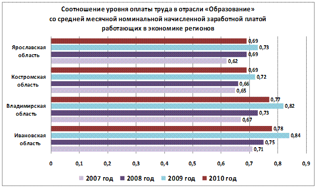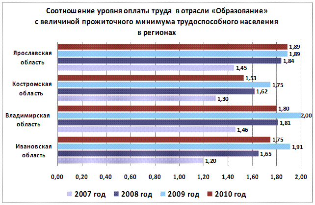 Сравненительные показатели Ивановской области и 4 соседних областей по данным статистики приведены в диаграммах: Ивановская область лидирует по показателю «Соотношение уровня оплаты труда в отрасли «Образование» со средней месячной номинальной начисленной заработной платой работающих в экономике», но занимает 3 место по показателю «Соотношение уровня оплаты труда в отрасли «Образование» с величиной прожиточного минимума трудоспособного населения».