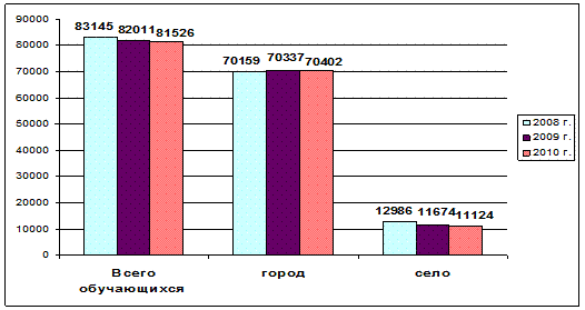 В городских школах на начало 2010-2011 учебного года число учащихся составило 70402 человек (2009 год – 70337человек), в сельских – 11124 человек (2009 год – 11674 человек). В то же время в первый класс в 2010 году было принято 9334 человека, на 342 человека больше, чем в 2009 году.