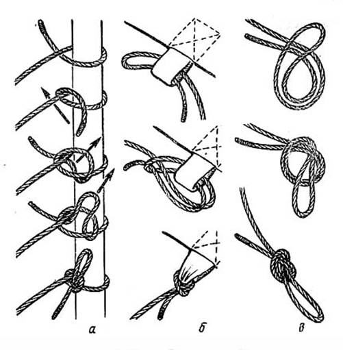 При креплении оттяжек не надо создавать системы запутанных, хитроумных узлов — потом их самим же придется долго развязывать. Вокруг дерева достаточно пустить оттяжку в один обхват и завязать узлом, как показано на рисунке 17, а.