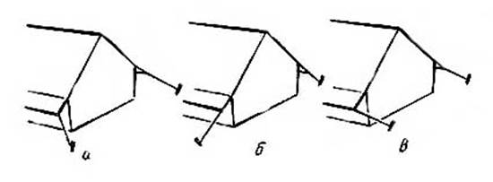 Рис. 18. Направление угловых оттяжек палатки: а — правильно; б, в — неправильно.