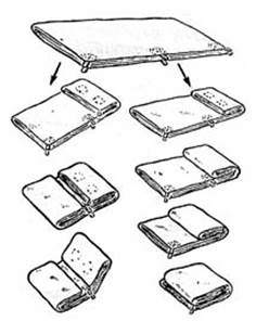 Сложенная таким образом палатка имеет вид прямоугольника или квадрата. Так укладывают палатку, если хотят ее положить к спине в рюкзак, который будет набит не очень туго. Если палатку, лежащую на земле, сложить еще раз по длине (как во втором способе), а уже потом складывать в прямоугольник, то получится укладка, удобная для переноски под клапаном рюкзака.