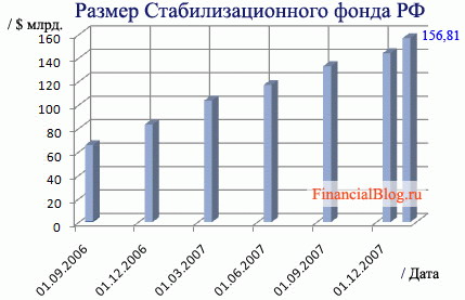 Совокупный объем Стабилизационного фонда РФ на 1 января 2008 года составил 3 трлн 849,11 млрд руб., что эквивалентно 156,81 млрд долларов США (по данным Министерства финансов РФ). Интересно: в прогнозе, данном Алексеем Кудриным в ноябре 2006 года, называлась цифра $159,9 млрд.