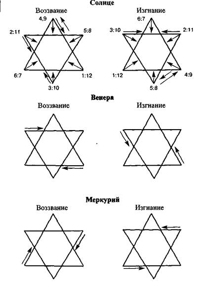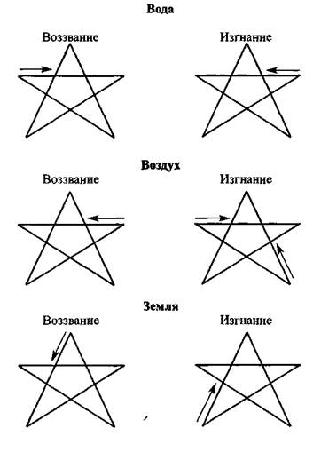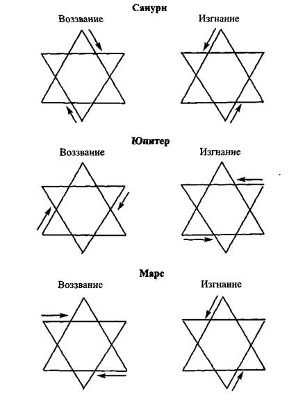 психическое состояние мага поскольку длительное вращение вызывает головокружение и иные сопутствующие измененному состоянию сознания признаки. К примеру, А. Кроули в своей работе "Магия в теории и на практике" советует совершать обход магического круга соответствующей походкой "легкой и крадущейся, почти не заметной, но весьма целеустремленной, как шаги подкрадывающегося тигра". Так же во время чтения заклинаний, вызывающих определенные силы маг совершает определенные жесты, соответствующие природе вызываемого существа или проводимой операции. Это соответствие выражается в принятии определенных поз - подобных характерным позам принятыми Богами (для примера воспользуйтесь изображениями египетских богов и богов древней Греции и Рима), а также повторяемыми в определенной последовательности и соответствующим числом. Кроме того, существуют иные позы применяемые в магическом искусстве - многие из которых придут к вам интуитивно в процессе усердной практики, некоторые из них приведены в недавно опубликованной работе А. Кроули "Магия в теории и на практике". Некоторые из жестов которые совершает маг в процессе освящения талисманов или иных магических операциях носят повторение очертаний двух наиболее известных в практической магии фигур гексаграммы (для планет) и пентаграммы для элементов: