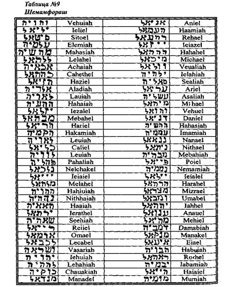 "Заклинаю вас, святые ангелы, именами: Кадос, Кадос, Кадос, Эсшерси, Эсшерси, Эсшерси, Хатим, Хатим, Иа - властителем веков, Кантин, Жаим, Жаник, Ание, Кальбар, Саббак, Бетифай, Альнаим.