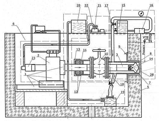 1-буровая установка с пультом управления; 2-вращатель; 3-бурильные штанги; 4-буровой инструмент; 5-крепь; 6-шахтный ствол; 7-ось скважины; 8-кондуктор; 9-фланец; 10-задвижка; 11-герметизатор; 12-герметизирующие элементы; 13- нажимная втулка; 14- обратный клапан; 15-резервная емкость; 16- подкачивающий насос; 17-подводящий трубопровод; 18- отводящий трубопровод; 19-накопительная емкость для бурового шлама; 20-сливная емкость; 21-буровой насос; 22-нагнетательный трубопровод, 23-сальник-вертлюг.