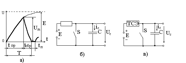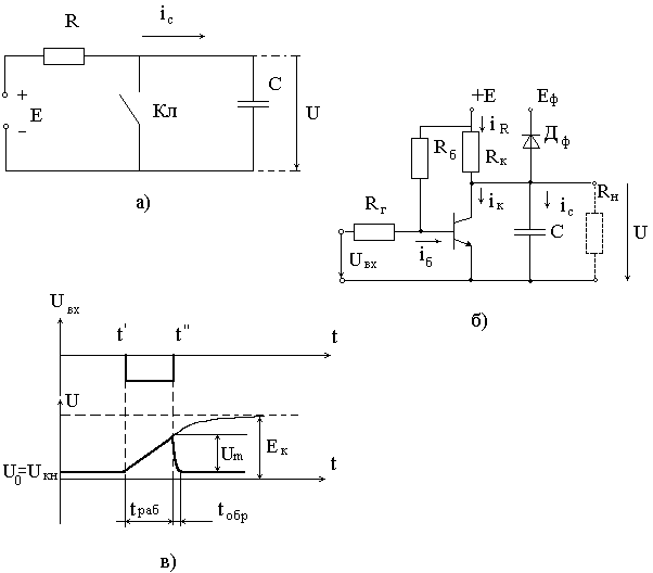 Простейший принцип получения пилообразного напряжения основан на процессе заряда или разряда конденсатора C через резистор R (рис.1.1.1,б). Если ключ S разомкнут, то конденсатор заряжается от источника постоянного напряжения E. При этом напряжение на конденсаторе Uc