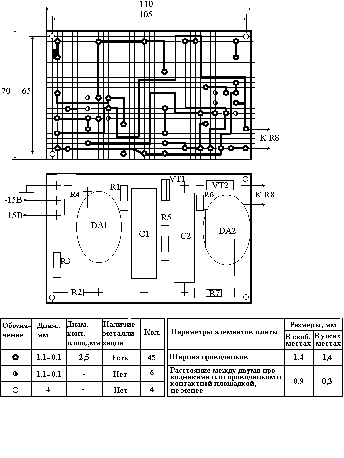 В результате разработки структурной и принципиальной электрической схем генератора пилообразного напряжения была дополнительно разработана печатная плата с 70×110 мм с соответствующими навесными радиоэлементами. Резистор нагрузки R8 расположен вне печатной платы поскольку имеет большие габариты. При конструировании печатной платы учитывался ряд особенностей: