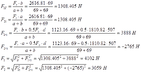 Радиальные реакции в опорах вала находим в двух взаимно перпендикулярных плоскостях. Составляющие радиальных реакций в направлениях окружной и радиальной сил на каждой из опор вала будут равны: