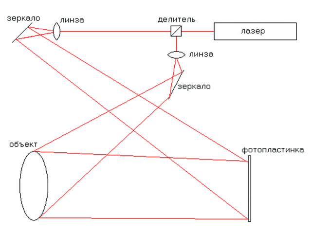 Голограмма создается, когда одиночный луч лазера расщепляется на два отдельных луча. Первый луч отражается от фотографируемого объекта, после чего второй луч сталкивается с отраженным светом первого. При этом они создают интерференционное изображение, которое затем записывается на пленку. Как только луч другого лазера попадает на пленку, возникает трехмерное изображение первоначального объекта (приложение 1).