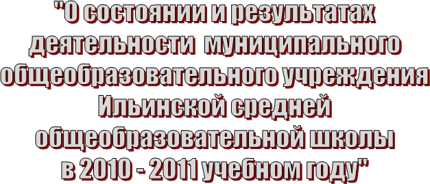 Деятельность муниципального общеобразовательного учреждения Ильинской средней общеобразовательной школы в 2010 – 2011 учебном году осуществлялась в соответствии с Законом Российской Федерации «Об образовании», Концепцией долгосрочного социально-экономического развития Российской Федерации на период до 2020 года, Стратегией социально-экономического развития Ивановской области до 2020 года, Стратегией социально-экономического развития Ильинского муниципального района до 2020 года и была направлена на реализацию основополагающих документов Президента Российской Федерации, Правительства Российской Федерации, документов Правительства Ивановской области и Ивановской областной Думы, документов администрации Ильинского муниципального района и Ильинского районного Совета депутатов.