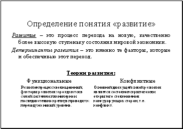 Развитие – это процесс перехода на новую, качественно более высокую ступеньку состояния мировой экономики, а детерминанты развития – это именно те факторы, которые и обеспечиваю этот переход