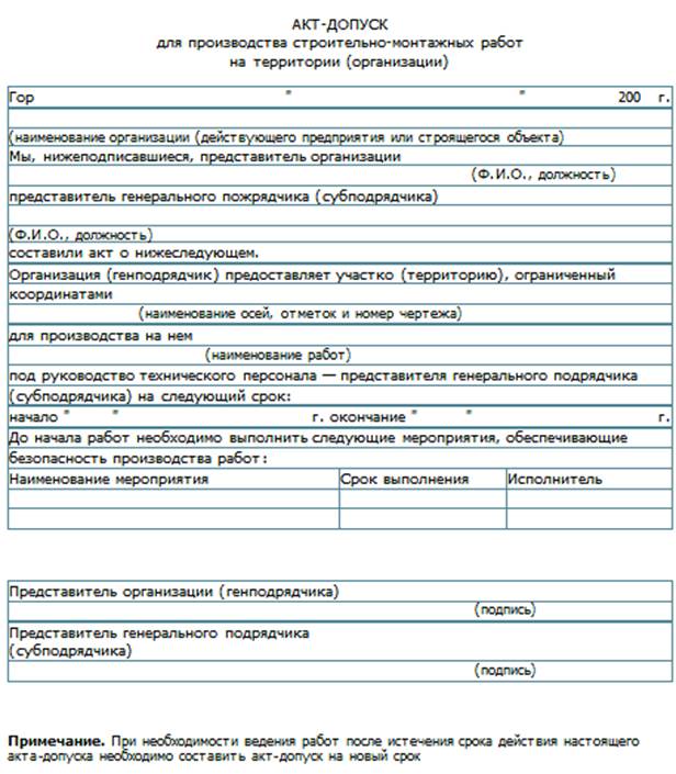 - Перед началом выполнения земляных работ на территории организации генеральный подрядчик (субподрядчик) и администрация организации, эксплуатирующая этот объект, обязаны оформить акт - допуск по форме приложения А к СНиП 12-03-2001.