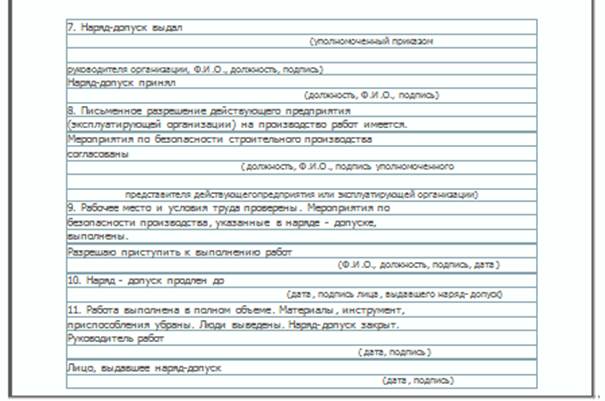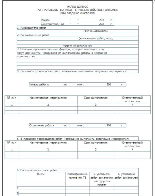 - На выполнение работ в зонах действия опасных производственных факторов, возникновение которых не связано с характером выполняемых работ, должен быть выдан наряд-допуск по форме приложения Б к СНиП 12-03-2001.