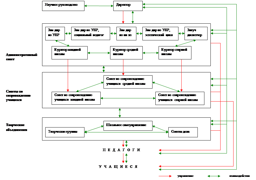 . Такой модели свойственно наличие не только привычной иерархической системы управления школой – вертикальных структур, но и разноуровневых объединений, интегрирующих в себе различные образовательные сферы и обладающих правом принятия коллегиальных решений в рамках, определённых концепцией школы – горизонтальных структур.