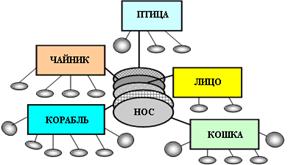 Нам представляется, именно такая модель может использоваться для синтеза и анализа структур образной информации. Предположим, условно, что некоторые образы представлены в формате фреймов. На рис.4 приведен пример ассоциации во фреймовом представлении знаний.