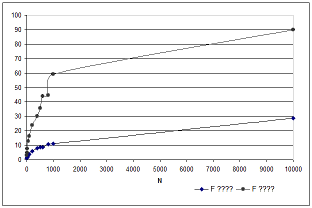 Моделирование также проводилось для большего значения N, но, поскольку при большом значении N вручную играть в игру нелегко, использовалась компьютерная версия игры “Erenfest”, в которой предусмотрено большое значение N (максимальное – 10 000), а также большое количество ходов (максимальное – 15 000). Исследовалось поведение заселения фишек в ящиках при разном значении N. Для исследования поведения флуктуаций в зависимости от N (флуктуация – случайное отклонение от среднего) в данной работе вычислялись максимальная (Fmax