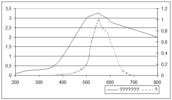 Дело в том, что глаз видит разные цвета неодинаково. Солнце излучает свет также неравномерно. Кривая видности (спектральная характеристика глаза) и кривая распределения энергии в солнечном свете представлены на рисунке.
