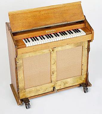 (с ит.: - маленькое фортепиано) имеет две педали, считается инструментом для домашнего музицирования, В начале ХIX в. на фабриках их изготовляли очень много и в борьбе за покупателя, производители шли на различные ухищрения, так появилось пианино с погремушками и даже пианино в форме скрипки.