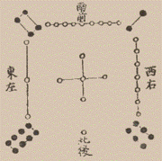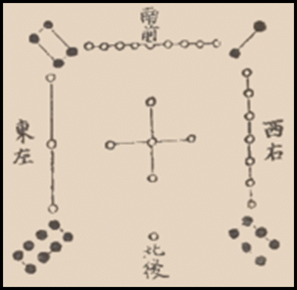 В китайской древней книге «Же-ким» («Книга перестановок») приводится легенда о том, что император Ню, живший 4 тысячи лет назад, увидел на берегу реки священную черепаху. На её панцире был изображен рисунок из белых и черных кружков(рис.1). Если заменить каждую фигуру числом, показывающим сколько в ней кружков, получится таблица.