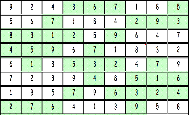 Давайте посмотрим на выделенную колонку: в ней также не хватает всего двух цифр- 2 и 7. Цифру 7 мы не можем вписать в первую сверху пустую клетку этой колонки, потому что в пересекающем колонку ряду уже есть цифра 7. Зато мы можем вписать в неё цифру 2, что и делаем! А для цифры 7 остается только одна пустая