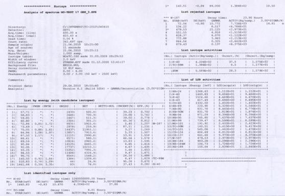 I”, на рис.10 приведен образец выводимых данных при обработке данного спектра. Судя по этим рисункам и приведенной ниже Таблице 5 можно сделать вывод, что содержание примесей в измеренных образцах препарата не превышало 0,5% от общей измеренной активности 131