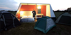 Развивается концепция мобильного гостиничного номера: британская компания Travelodge предлагает путешественникам остановиться в подобном номере вместо того, чтобы брать с собой палатку (рис. 5). Такой номер представляет собой сооружение размером 6 на 2,4 метра, в котором есть кровать, кондиционер, обогреватель, телевизор, DVD-плеер и фильмотека, а также душ и биотуалет. Заказать доставку мобильного номера можно в любую точку Великобритании, а стоимость размещения не отличается от стандартных цен Travelodge - 26 фунтов стерлингов ($51,9). По утверждению владельцев компании, эта услуга особенно актуальна для туристов, приезжающих на музыкальные фестивали или другие мероприятия под открытым небом.