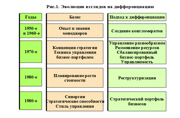 Когда стратегическое планирование в 60-х гг. стало входить в практику, его главным объектом стала диверсификация деятельности фирмы. По мере того как в связи с нестабильностью технологий, изменениями в условиях конкуренции, замедлением темпов роста, появлением социально-политических ограничений и т. д. возрастало количество задач стратегического характера, становилось все очевиднее, что путем простого добавления новых видов деятельности нельзя решить все возникающие проблемы. Поэтому в 70-е гг. внимание разработчиков стратегии, в том числе И. Ансоффа, переключилось с диверсификации на манипулирование целым набором отраслей, видов деятельности, на которых специализируется фирма. Это было ускорено тем обстоятельством, что различные виды деятельности, которые фирма осваивала постепенно, стали все более расходиться между собой по таким показателям, как перспективы дальнейшего роста, рентабельность и стратегическая уязвимость фирмы.