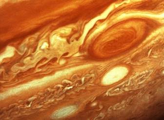 Наиболее известная и самая заметная из таких деталей - Большое Красное Пятно, которое наблюдается уже около 340 лет. Находясь в умеренных южных широтах Юпитера, оно медленно перемещается, делая за сто лет примерно 3 оборота. По краям Красного Пятна располагаются облака, состоящие из аммиака. По предыдущим наблюдениям космической станцией Galileo, также принадлежащей NASA, граничные области Большого Красного Пятна вращаются с большой скоростью против часовой стрелки, в то время как внутренняя часть медленно вращается в противоположном направлении. За последнее время Большое Красное Пятно несколько изменилось. На фотографиях, полученных ранее космическими кораблями NASA Voyager и Galileo, Пятно окружает темная область, что указывает на отсутствие облаков вокруг него. Теперь же эту область заполнили светлые аммиачные облака.