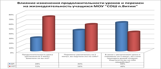 В связи с увеличением продолжительности урока и большой перемены на 5 минут, я провела анкетирование и составила диаграмму, отражающую как, отразилось увеличение времени на учеников. Вывод: изменение продолжительности урока и перемены на 5 минут практически остались незамеченными для учащихся. Но увеличение общей продолжительности занятий в этом случае заметили все.