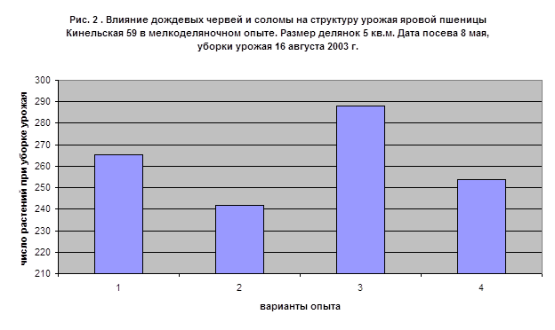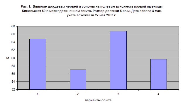 ). На них 8 мая 2003 г. высеивали яровую пшеницу, вручную в рядки через 2 см на глубину 3-4 см. Расстояние между рядками - 15 см. Сорт пшеницы – яровая мягкая Кинельская 59. Перед посевом пшеницы в почву вносили измельченную ячменную солому, равномерно перемешанную с почвой. Из дождевых червей для опытов использовали взрослых особей доминирующего в Самарской области типичного почвенного, питающегося перегноем вида Nicodrilus