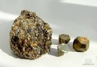 Отдельные кристаллы и включения пирита в жильном кварце, золото гор. Встречается в горах Урала почти повсеместно.