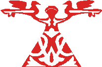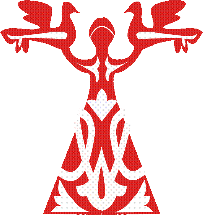 Изображена женская фигура в белой одежде, расписанной красным узором. Оказывается, главной фигурой на узорных вышивках славянских народов языческих времен является женщина в широкой юбке колоколом с поднятыми руками, переходящими в изображение птиц (ветви дерева). «В представлении древних художников – это богиня Берегиня, символ жизни и плодородия. Изображая ее на предметах быта (полотенцах, одежде), женшины считали, что это принесет в дом счастье и гармонию. Орнаментальное украшение на юбке – стилизованная узелковая письменность языческих времен. До появления письменности информацию передавали путем плетения узелков на палку. Каждый узелок – понятие (слово). Позднее они трансформировались в вышивку. Женщина, хранительница очага, вышивая узелки-символы, обозначающие древних богов, как бы задабривала их и просила благосклонного отношения к ней и ее семье. Цвет несет смысловую нагрузку. Красный считался красивым.»1