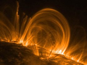 Кроме этого, в периоды солнечной активности часто наблюдаются солнечные вспышки - мощные локальные выбросы энергии с поверхности Солнца, солнечные вспышки сопровождаются не только кратковременным усилением излучения определённого участка Солнца, но и выбросами заряженных частиц, которые, достигая магнитного поля Земли, вызывают его возмущения, неблагоприятно сказывающиеся на здоровье некоторых людей и работе приборов. Само Солнце также имеет очень мощное магнитное поле, на фотографиях поверхности Солнца видно, как оно искривляет потоки плазмы, выбрасываемые с поверхности (см. рис).