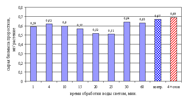 Опыты выполнялись через 9 дней после обработки воды светом. Повторность опытов трехкратная. До опытов пробы воды хранились в полиэтиленовых прозрачных бутылках при комнатной температуре в естественных условиях освещения.