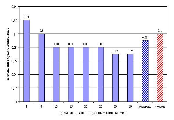Как показали результаты экспериментов, у всех вариантов с освещением сырая биомасса проростков была меньше, чем в контроле (рис.1). Причем следует отметить, что, начиная с 10-минутного варианта, идет падение темпов накопления биомассы, а с 30-минутного варианта идет снова нарастание биомассы, но не достигает контроля. Озонирование положительно сказывалось на накоплении сырой биомассы, показатели превышали вариант без озонирования на 11%.