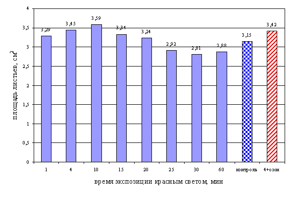 Одним из наиболее существенных показателей морфофизиологического состояния растений является площадь листьев. Как выяснилось, длительность обработки воды красным светом влияла на формирование листового аппарата у проростков пшеницы. Если обработка воды от 1 до 10 минут стимулировало рост листьев, то вода с большим временем экспозиции тормозила это процесс (рис. 3). Эти данные коррелируют с данными по накоплению сухой биомассы. Можно предположить, что накопление сухой биомассы лимитировалось размерами фотосинтетического аппарата. Однако, для более полной картины необходимы данные по составу пигментного аппарата.